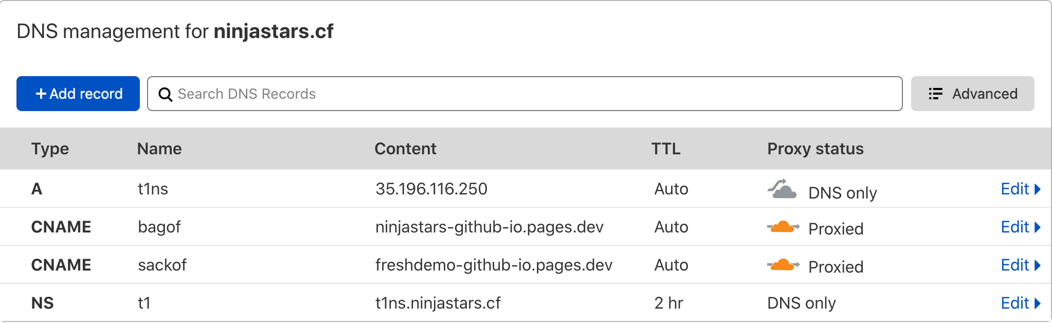 The following screenshot from Cloudflare Dash shows that an A record has been created for my malicious name server, currently at 35.196.116.250. This is the host we will run Iodine on. From there an entire subdomain has been delegated to that malicious name server, t1.ninjastars.cf.