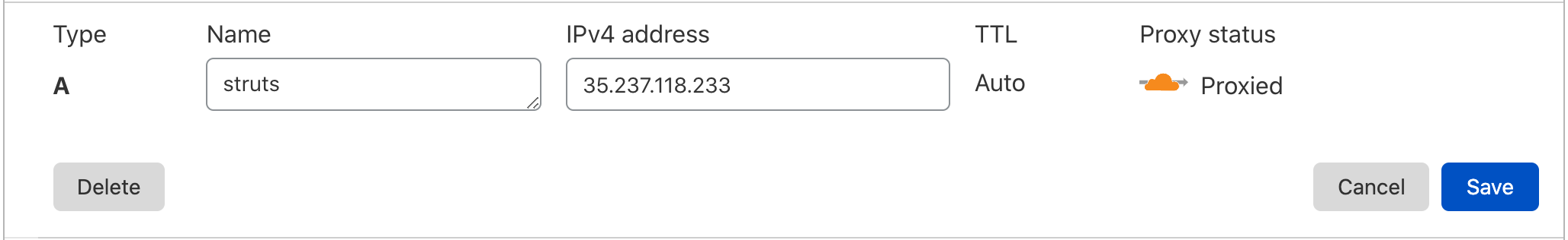 In Dash create a subdomain called struts, point it to your origin, and ensure the traffic is being proxied (orange clouded).