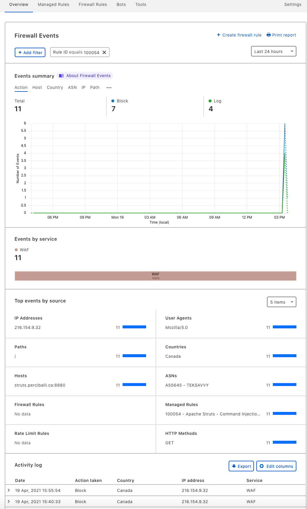 ID 100054, Apache Struts - Command Injection - CVE:CVE-2017-5638and ensure the action is set to Block.